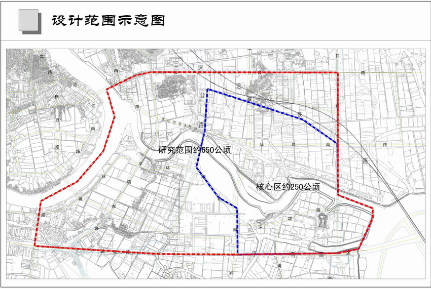 规划范围:城市设计包括两个层次:(1)片区整体城市设计研究,范围是武广高速铁路与平南高速之间地区,总研究面积约650公顷;(2)核心区城市设计和重点设施概念方案设计,范围是一河两岸核心地区,总面积约250公顷。